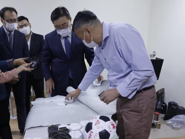 УИХ-ын дарга Г.Занданшатар монгол сарлагийн ширийг боловсруулан, хөлбөмбөгийн бөмбөг үйлдвэрлэж буй “Монгол бөмбөг” үйлдвэрийн үйл ажиллагаатай танилцлаа. Тус үйлдвэрийн менежер Б.Эрдэнэбаяр УИХ-ын даргыг угтан авч, бүтээгдэхүүн үйлдвэрлэлийнхээ талаар танилцуулсан.