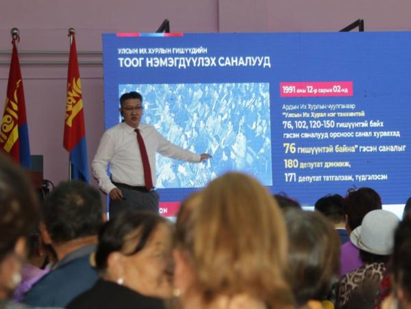 Иргэдийг төлөөлөх парламентын чадамжийг сайжруулах зорилгоор УИХ-ын гишүүдийн тоог 152 болгон хүн амын тоотой уялдуулан нэмэгдүүлэхээр, нийт гишүүний тавин хувийг мажоритар, тавин хувийг пропорционал аргаар сонгох зохицуулалтыг төсөлд тусгасан талаар танилцуулж, холбогдох судалгаа, мэдээллийг дэлгэрэнгүй тайлбарласан юм. Түүнчлэн төсөлтэй холбогдуулан иргэдийн байр суурийг сонсож, саналыг авсан юм.