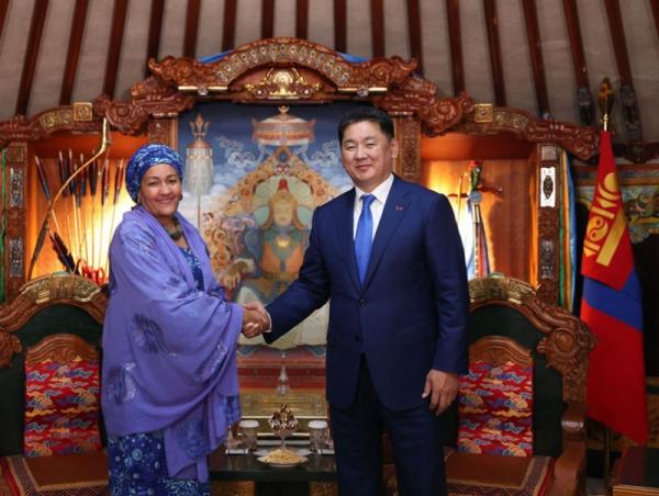 Монгол Улсын Ерөнхийлөгч Ухнаагийн Хүрэлсүх Дэлхийн эмэгтэйчүүдийн чуулга уулзалтад оролцож буй НҮБ-ын Ерөнхий нарийн бичгийн даргын орлогч Амина Мохаммедыг хүлээн авч уулзлаа.